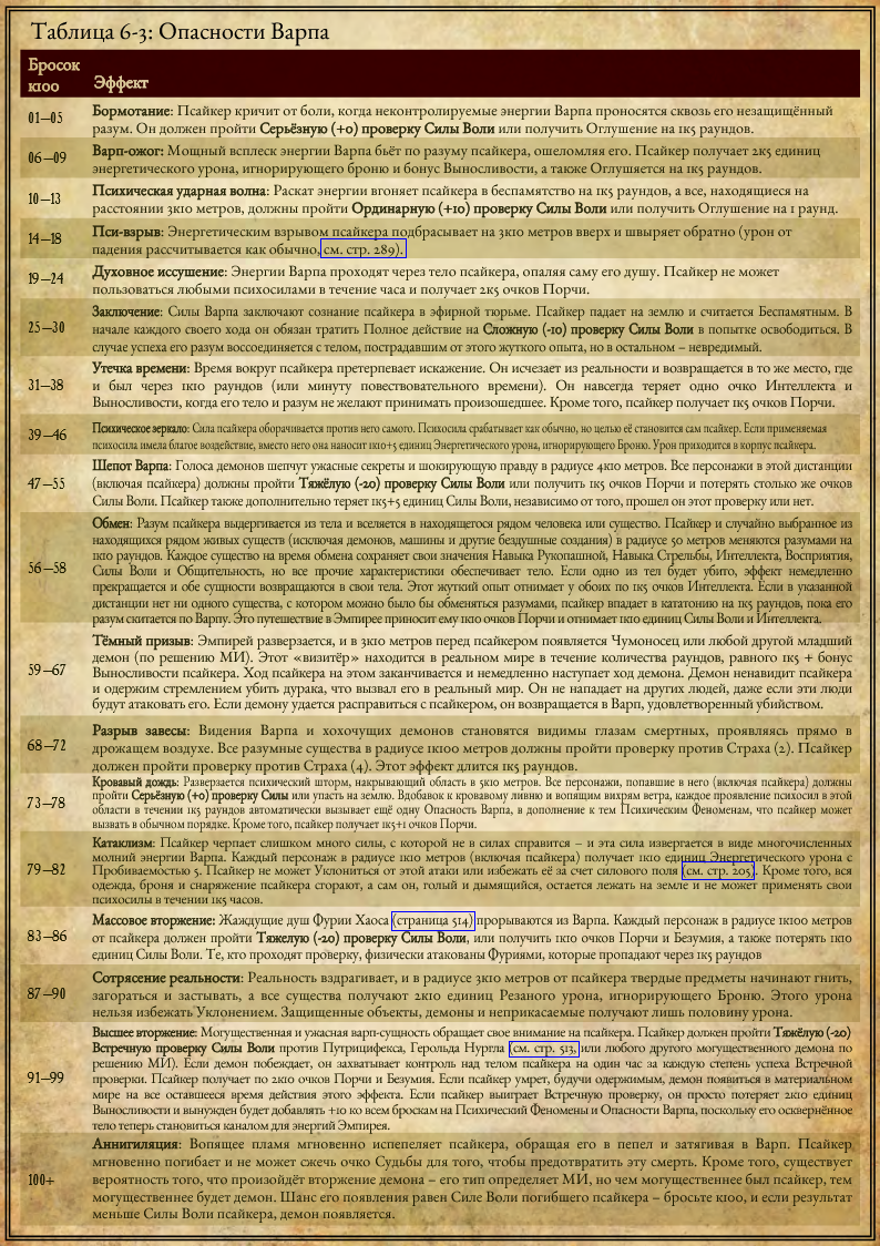 | 06-09 | Варп-ожог: Мощный всплеск энергии Варпа бьёт по разуму псайкера, ошеломляя его. Псайкер получает 2к5 единиц энергетического урона, игнорирующего броню и бонус Выносливости, а также Оглушяется на 1к5 раундов. |